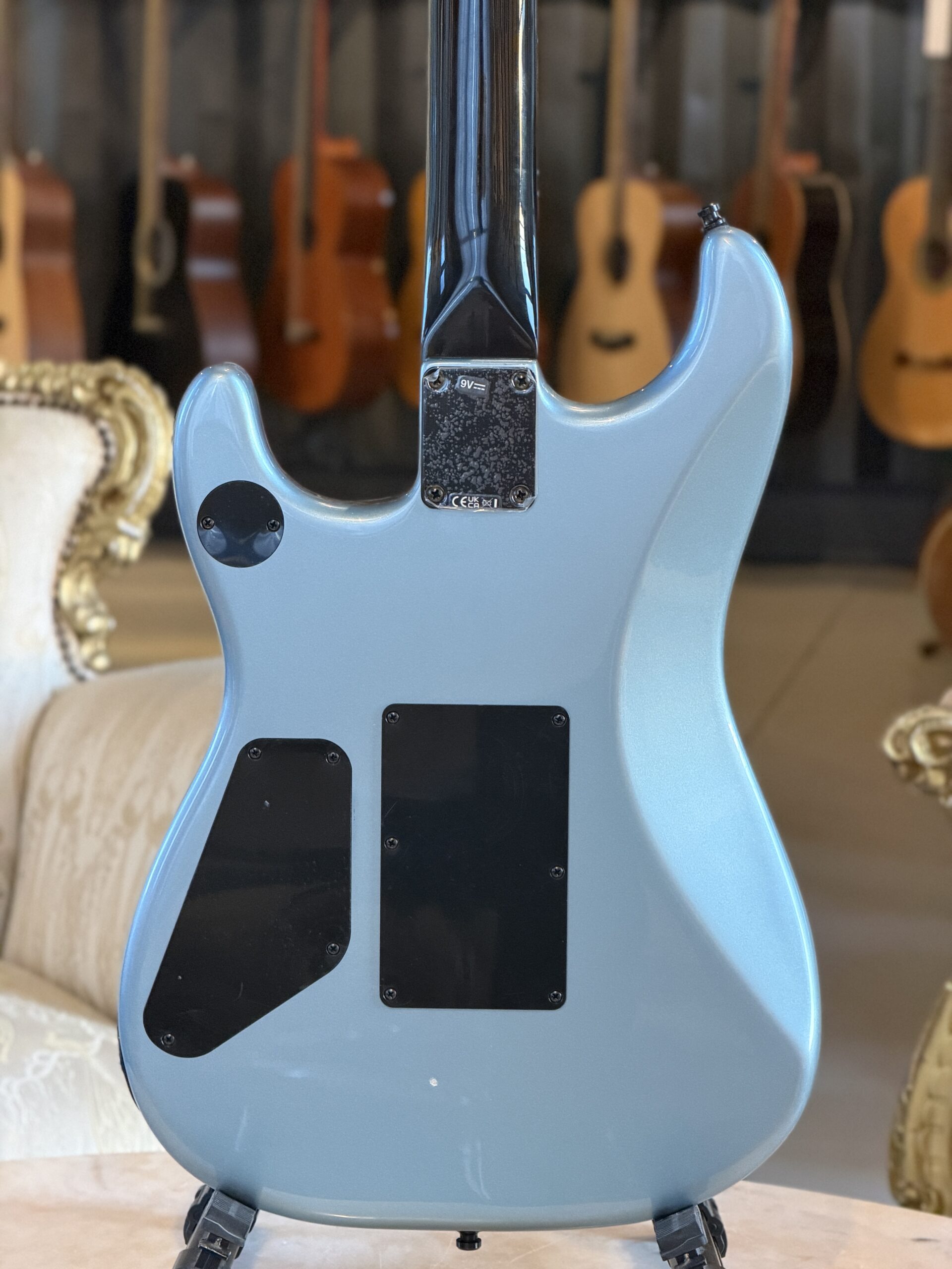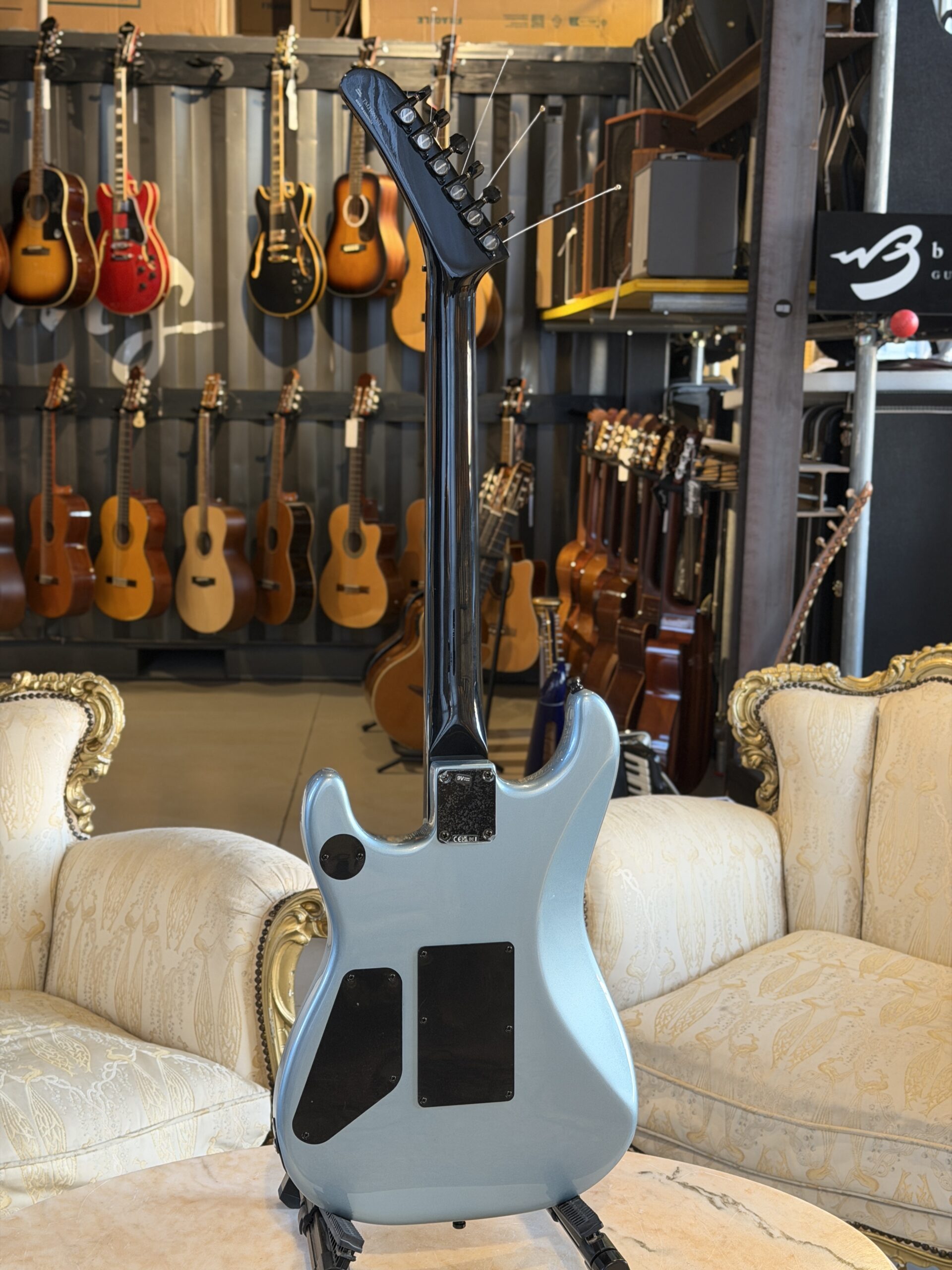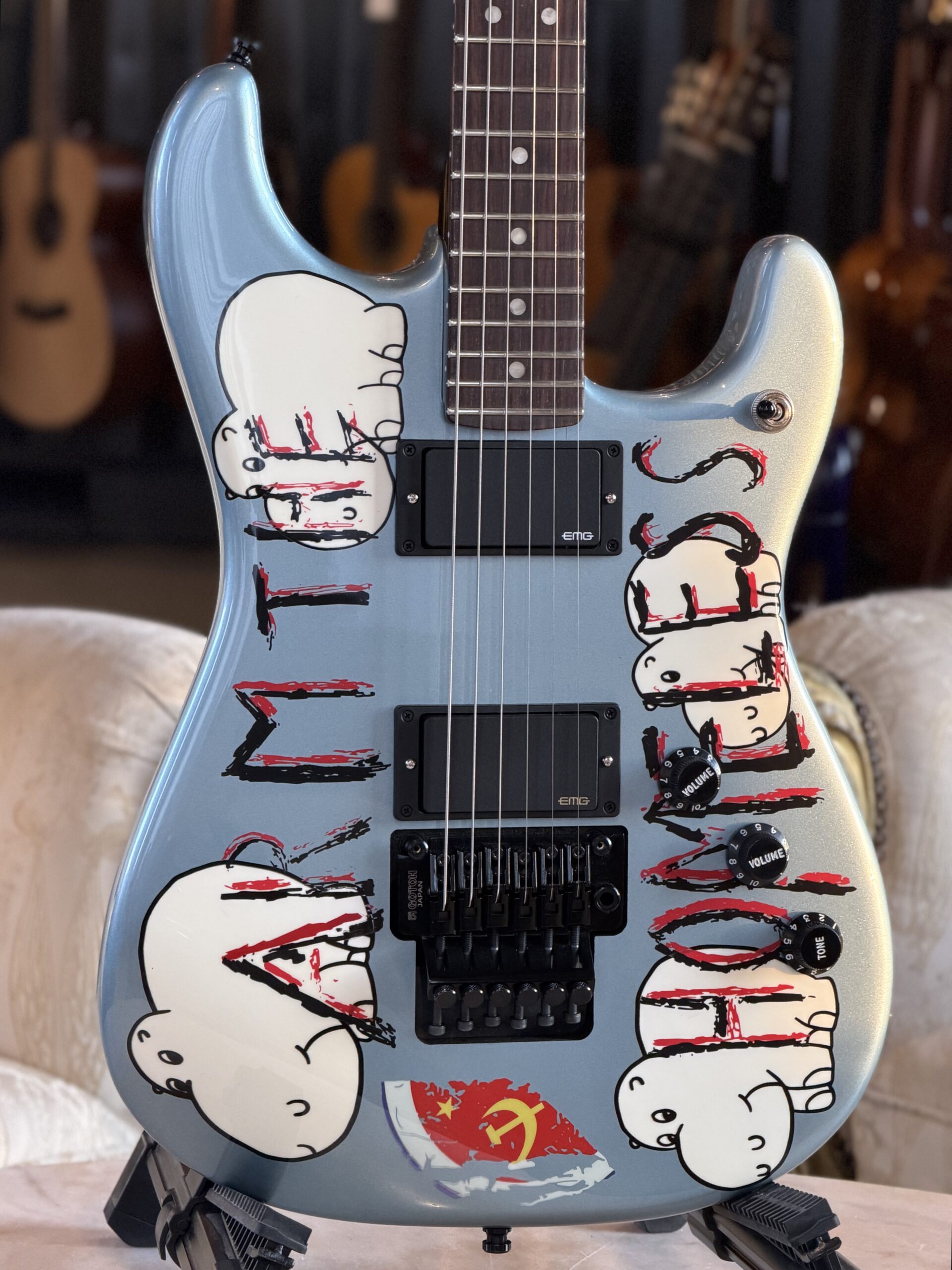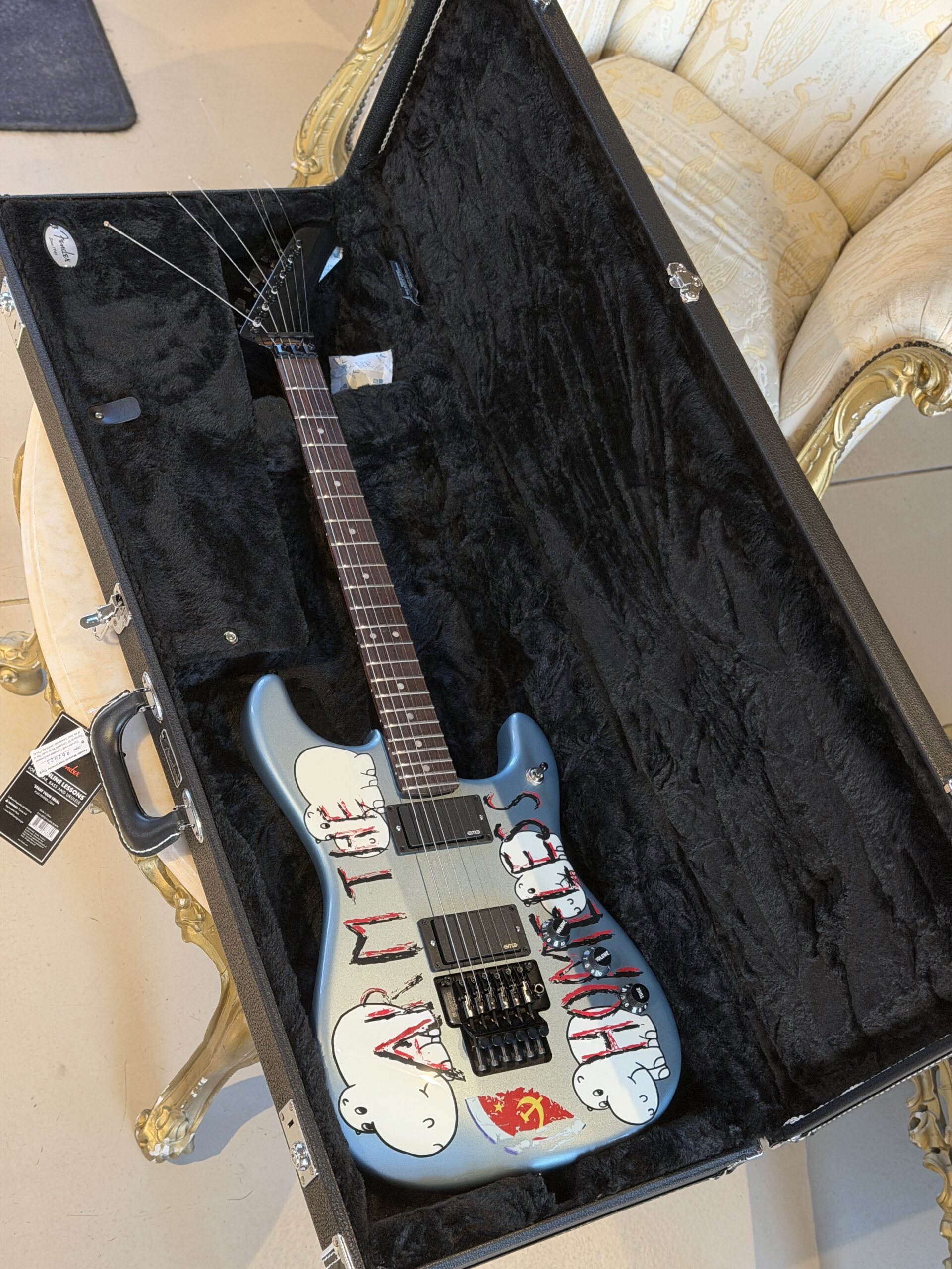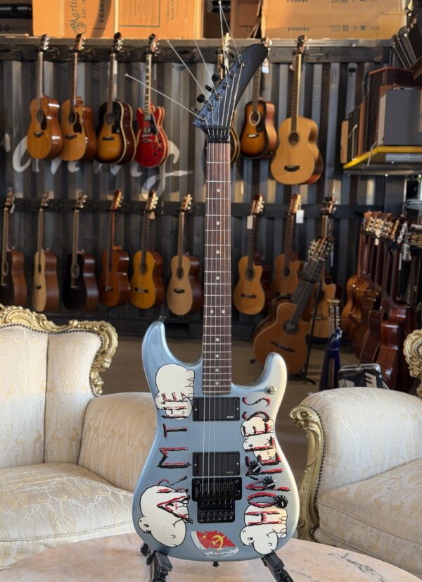 Adornata con il suo slogan provocatorio e i disegni degli ippopotami eseguiti a mano sulla finitura Blue Ice Metallic, questa chitarra è perfetta nel suo ruolo di strumento che si trasforma in un simbolo potente della ribellione artistica. Ogni componente, inclusa la sua caratteristica paletta a forma di mazza da hockey e i suoi messaggi visivi catturano l’impegno incrollabile per l’innovazione musicale e il cambiamento sociale di Morello.
