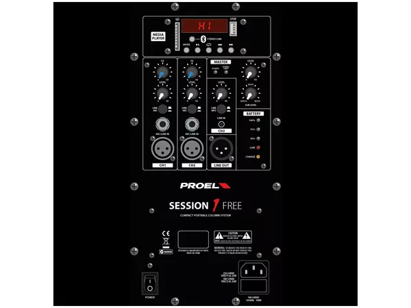 Session1Free è un sistema a colonna portatile dotato di ingressi multipli e di un versatile lettore MP3 con connettività Bluetooth. Alloggiato in cabinet in polipropilene leggeri e allo stesso tempo robusti, è formato da una colonna con 4 altoparlanti full-range da 2.5″ ed un potente subwoofer da 8″. L’elettronica allo stato dell’arte include una sofisticata sezione di pre-amplificazione con filtri attivi e doppi Limiter, ed un potente amplificatore in Classe D da 400W. La batteria agli ioni di Litio incorporata fornisce fino a 8 ore di autonomia, consentendo la massima libertà di movimento. Il Media Player che trovate a bordo è in grado di riprodurre musica non solo da una card SD o da una chiavetta di memoria USB, ma anche dal vostro smartphone o tablet attraverso una connessione Bluetooth, senza bisogno di cavi. Il mixer a tre canali incorporato permette di collegare 2 microfoni o sorgenti linea ed un player stereo. Un effetto digitale è disponibile per gli ingressi microfonici. Con una semplice manopola è possibile ottimizzare il suono per voce, musica o bassi spinti adattando il sistema ad ogni situazione. Session1Free può essere utilizzato in una varietà di applicazioni, dalla diffusione vocale e di musica dal vivo, alla riproduzione di musica e ai DJ set.